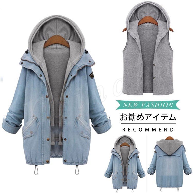 Gジャン ジージャン デニムジャケット 重ね着 2点セット 裏起毛 ベスト付き フード付き デニム 防寒 M L XL XXL レディース