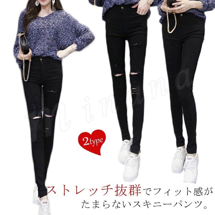 パンツ レギパン スキニー レギンス ストレッチ ロング丈 ハイーウェスト ダメージ加工 デニム ボトムス 無地 ブラック 大きいサイズ