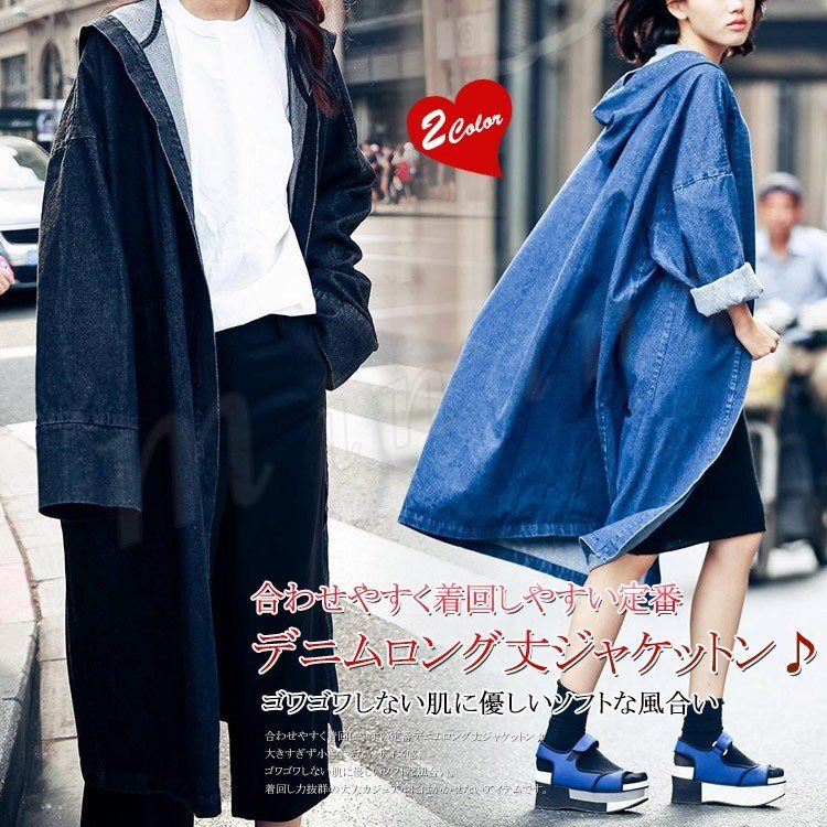 [2色]デニムロング丈ジャケットン 長袖 レディース フード付き ロング丈 デニム ジャケット アウター ライトアウター 羽織り 羽織物