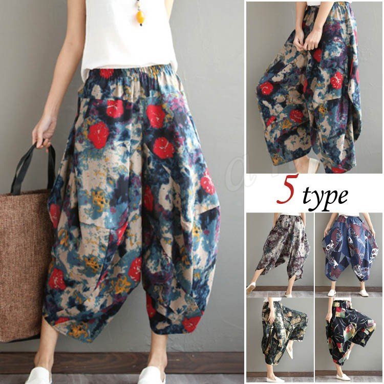 レディース 森ガール ボトムス サルエルパンツ エスニック ガウチョパンツ ワイド バルーン ナチュラル 9分丈 ウエストゴム