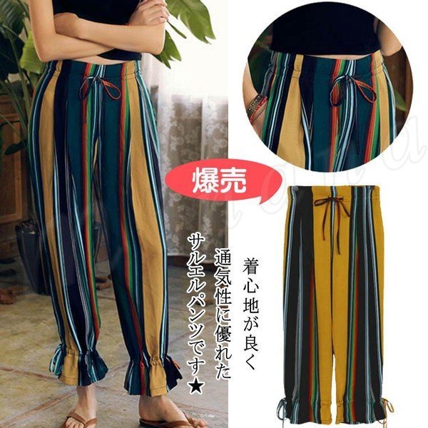 サルエルパンツジョガーパンツボトムスレディースウエストゴムストライプゆったり大きいサイズ薄手美尻ボヘミア風ロング丈海外民族風