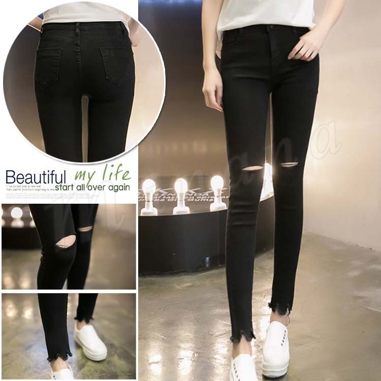 ボトムス パンツ デニム スキニー ダメージ クラッシュ ハイウエスト 膝あき 美脚 白 黒