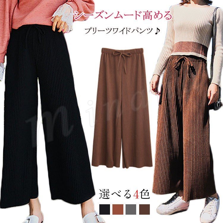 [4色展開]プリーツワイドパンツ ガウチョパンツ レディース ボトムス パンツ プリーツ ボックスプリーツ ニット フレア 9分丈 秋冬 女子
