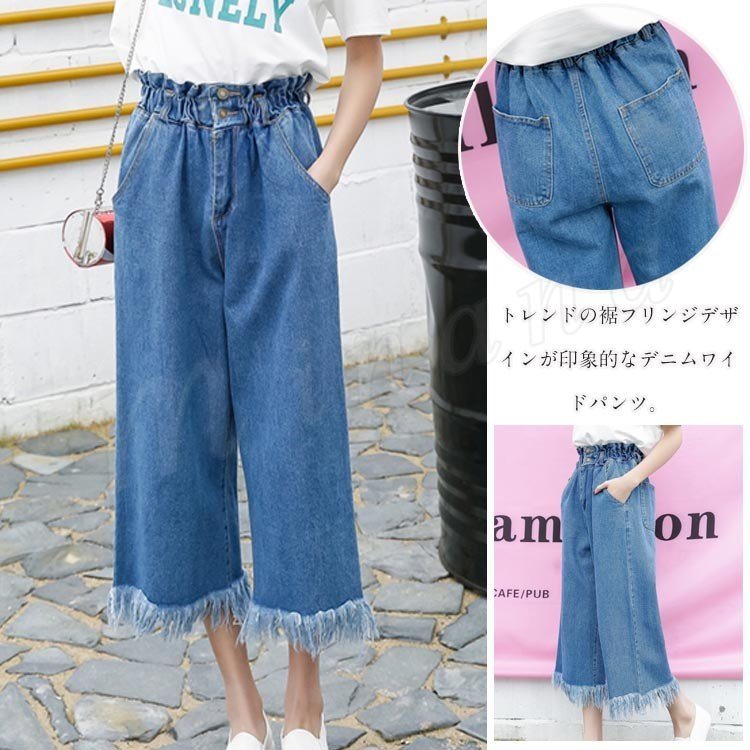 裾フリンジ デニム ワイドパンツ ガウチョパンツ カットオフ フレアパンツ ハイウエスト