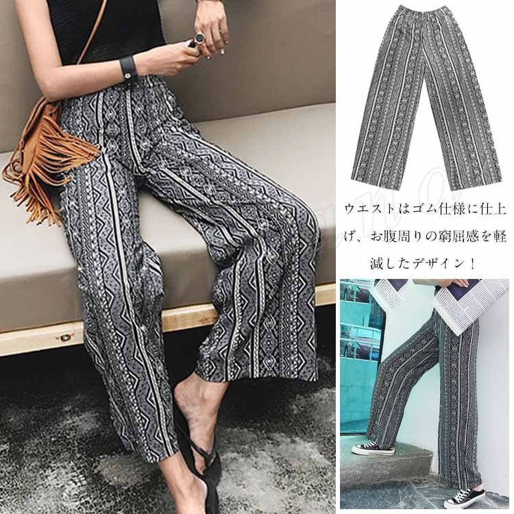 レディース ワイドパンツ ボヘミア リゾート エスニック柄 サマー ガウチョパンツ ゆったり ボトムス 2018春新作