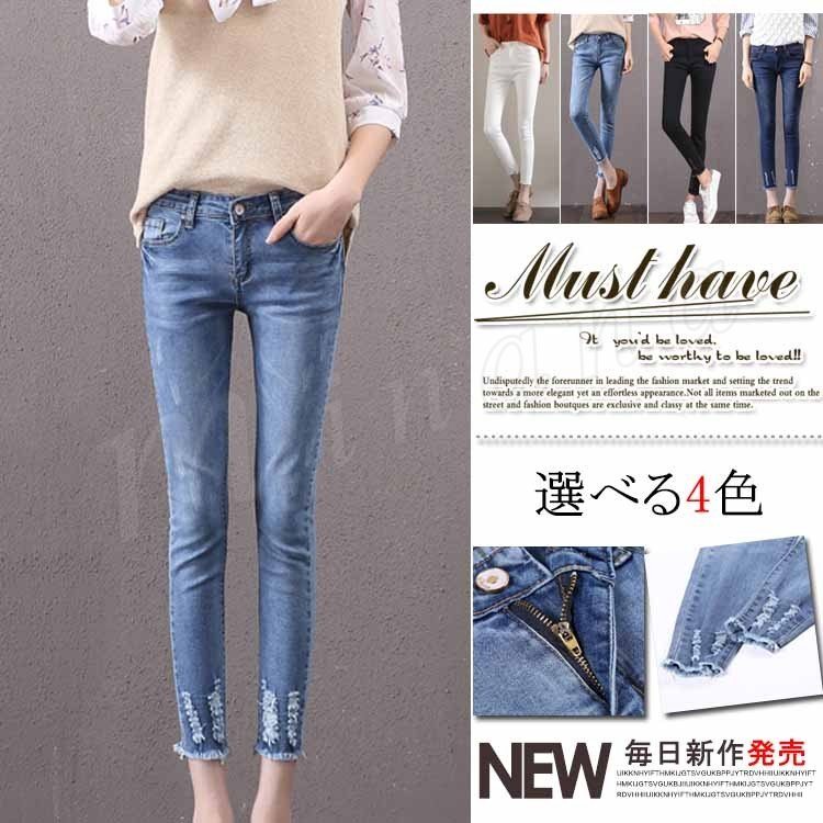 レディース ボトムス パンツ スキニー レギンス デニム ストレッチ スリム 裾フリンジ ダメージ加工 9分丈