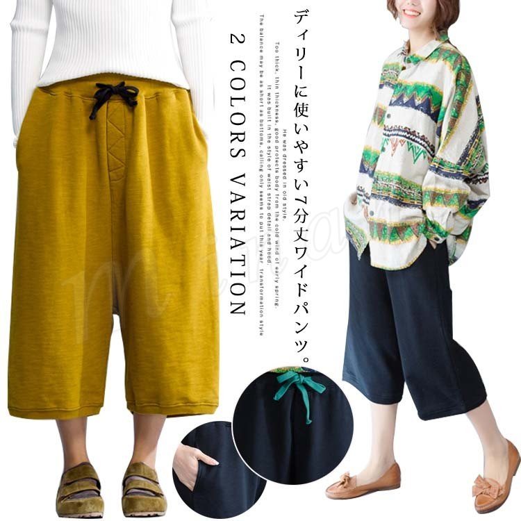 ワイドパンツ レディース 春夏秋 フレア ワイドルーズ イージーパンツ ジャージー生地 ポケットあり アンクル丈 伸縮性あり 裏地なし 透け感