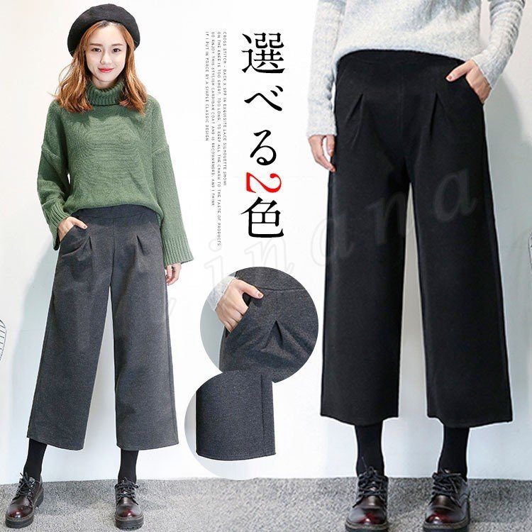 レディースガウチョパンツ大きいサイズ九分丈ワイドパンツロングパンツ厚手パンツ無地ナチュラル風ガチョウパンツ秋冬ワイドパンツ2017