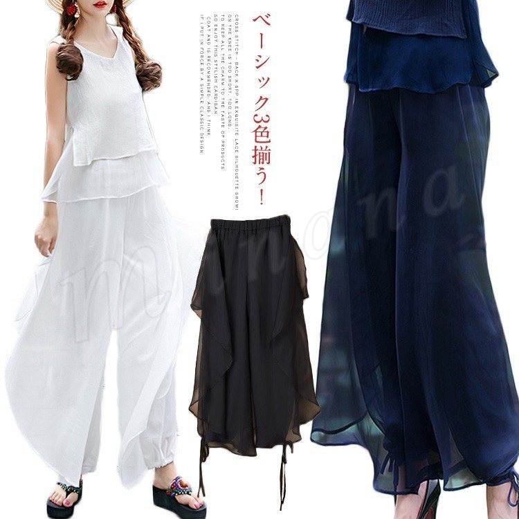 軽くてふんわりとしたシルエ。ガウチョパンツ シフォン ロングパンツ レディース ロング丈 ワイドパンツ ヨガパンツ ダンス衣装 フレアパンツ