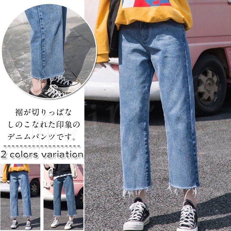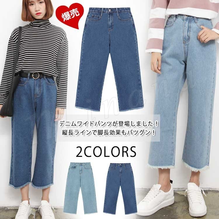 裾フリンジ 7分丈 デニム パンツ デニム ワイドパンツ ガウチョパンツ 裾切りっぱなし デニムパンツ ストレートパンツ ウォッシュ加工 レデ