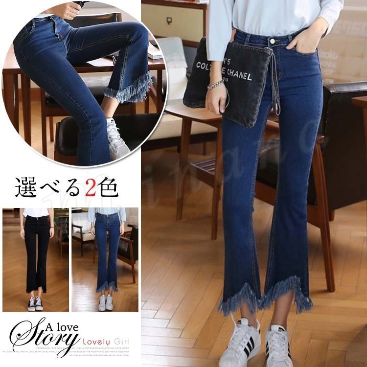 2018春新作/デニムパン・・フレアパンツ/レディース/フリンジ/ワイド/九分丈/ジーンズ/着痩せ/大きいサイズ/スキニー/ファッション/おしゃれ