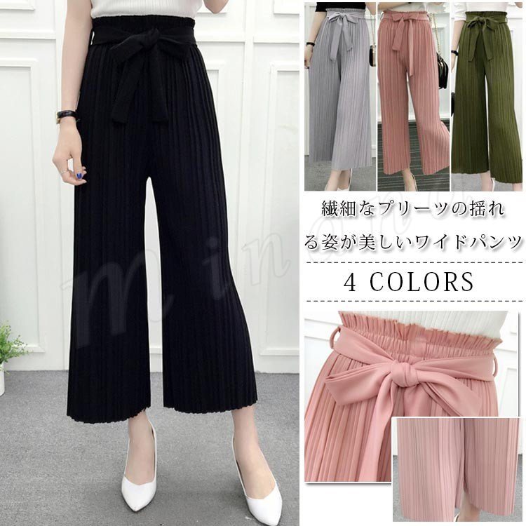 ウエストリボン ワイドパンツ フレアパンツ 9分丈 ワイドパンツ スカーチョ プリーツ ガウチョパンツ プリーツ 春夏 ゆったり ロングパン