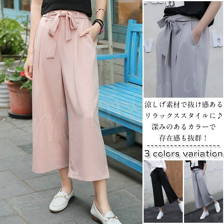 レディース ボトムス ガウチョパンツ ワイドパンツ ウエストゴム リボン付き 9分丈 スカーチョ ゆったり シンプル 着やせ 3カラー 5サイズ S~