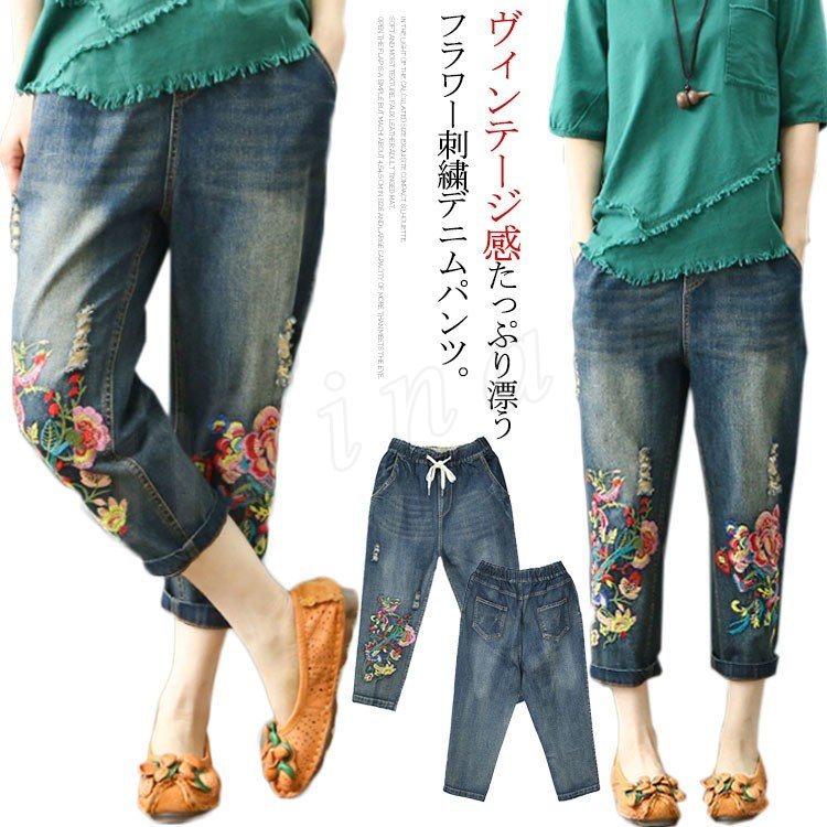 刺繍デニムパンツ レディース 七分丈 フラワー刺繍パンツ デニムパンツ クロップドパンツ アンクル デニム ジーンズ カジュアル 花柄 刺繍 春 夏