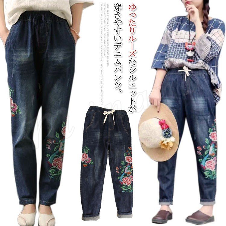 カジュアルおしゃれ!デニム サルエルパンツ フラワー刺繍 デニム テーパードパンツ カジュアルパンツ レディース ジーンズ デニムパンツ フ