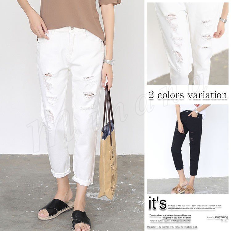 ダメージ加工 デニムパンツ ジーンズ 美脚 ロールアップ クロップドパンツ カジュアル ジーパン