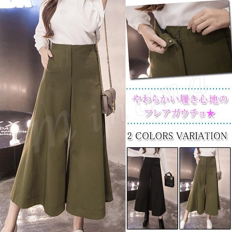 ガウチョパンツ/スカーチョ/スカンツ/ワイドパンツ/フレア裾/Aライン/ロングパンツ/無地/大きいサイズ/ハイウエスト/ファッション/フェミニ