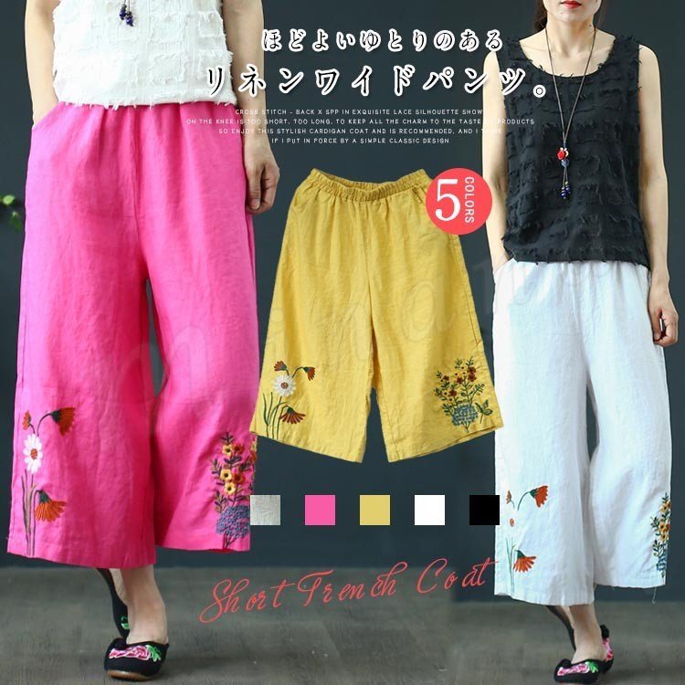 花柄刺繍ワイドパンツ リネンパンツ ワイドパンツ ガウチョパンツ リネン リラックスパンツ イージーパンツ 花柄 刺繍 カジュアル 春 夏 ナチュラル