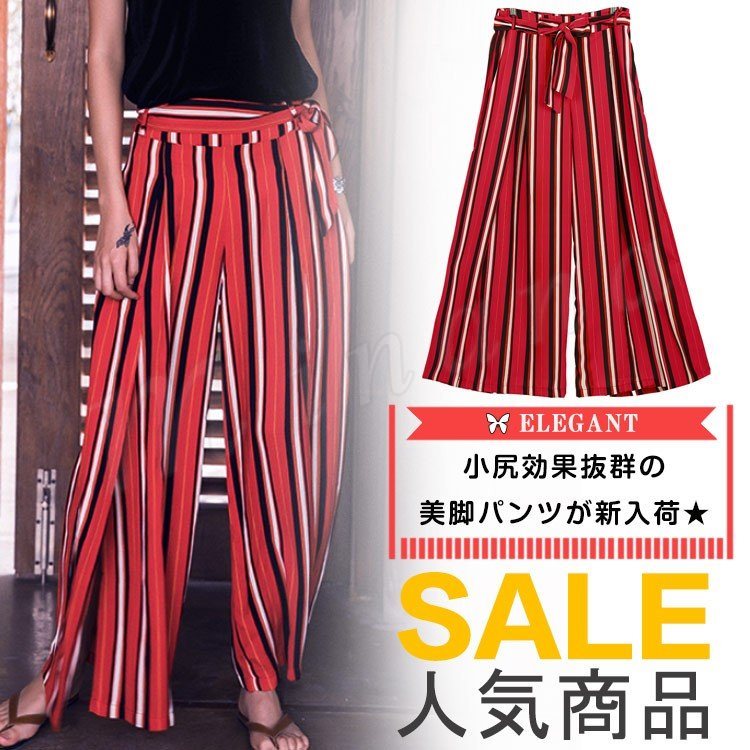 スカーチョガウチョパンツレデイーススカンツゆったりワイドパンツストライプ柄ハイウェストスリット入り体型カバー美尻セクシ?薄手