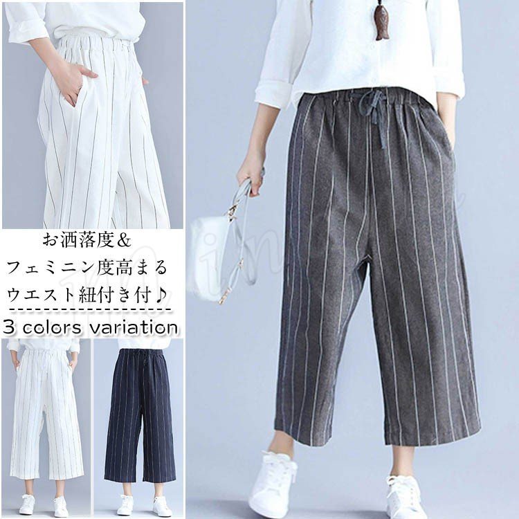レディース ボトムス ワイドパンツ スカーチョ 7分丈 ガウチョパンツ ストライプ ロングパンツ リネン混 紐付き スカンツ Aライン 3カラー フリ