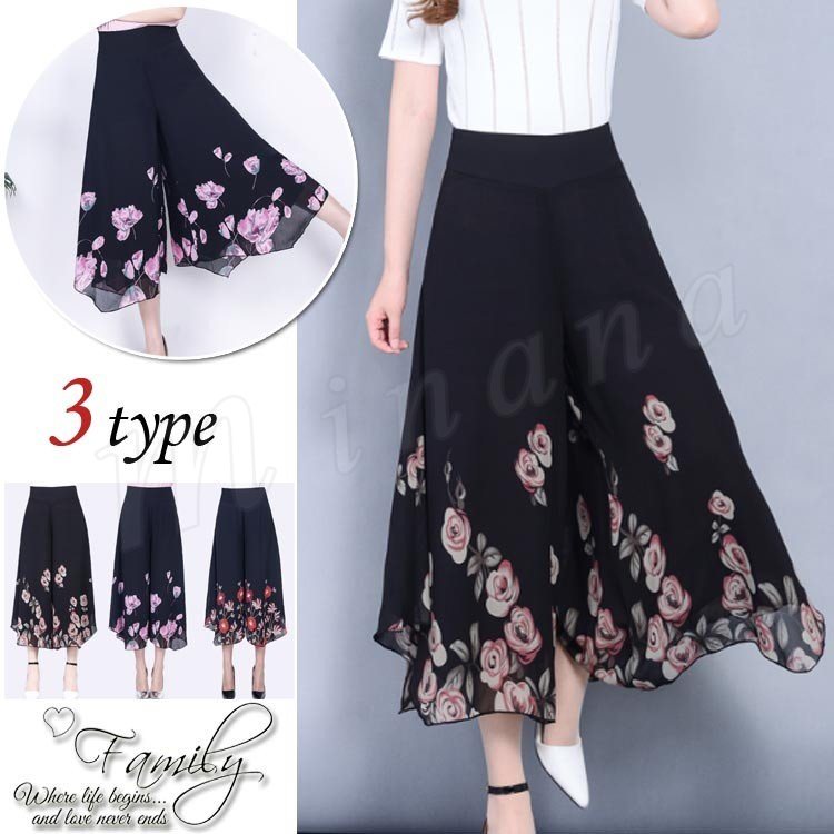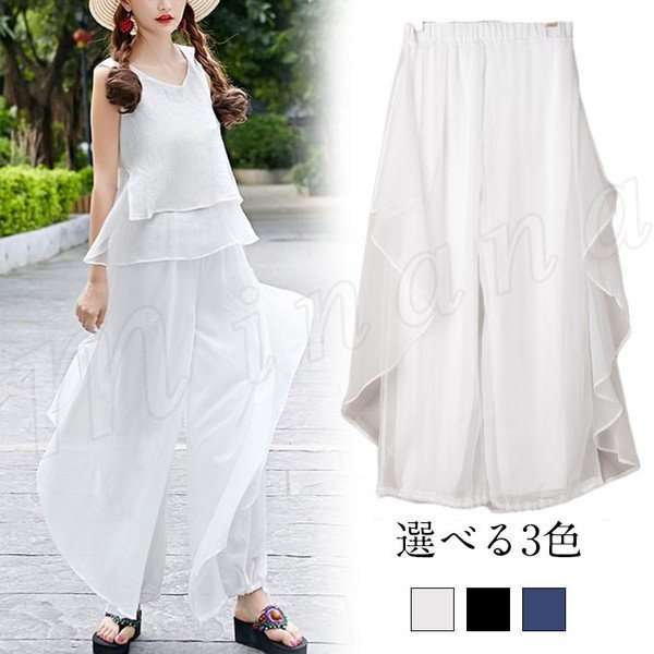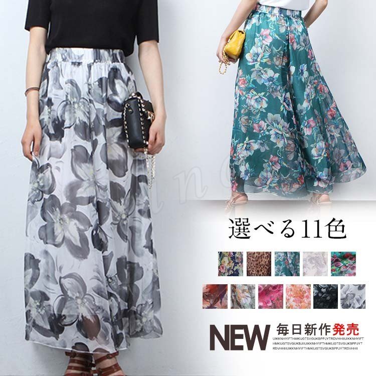 春夏 新作 レディース フレア ウエスト ゴム ガウチョ 人気 着回し シフォン デート ファッション 20代30代 ゆったり ロング オシャレ