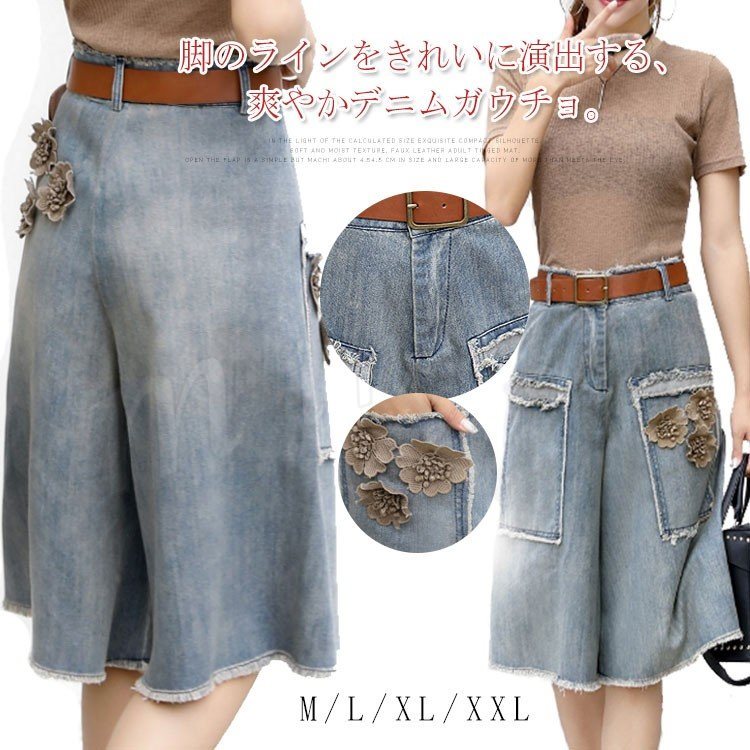 デニムワイドパンツ ガウチョ デニムパンツ レディース ガウチョパンツ 五分丈 コットン パンツ スカーチョ カジュアル 上品