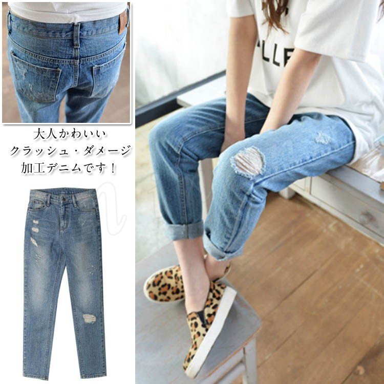 人気のボーイフレンドデニム♪ ボーイフレンドデニム クラッシュデニム ダメージジーンズ 9分丈 穴開き ボトム