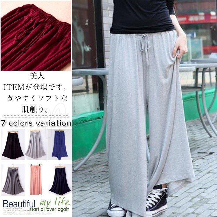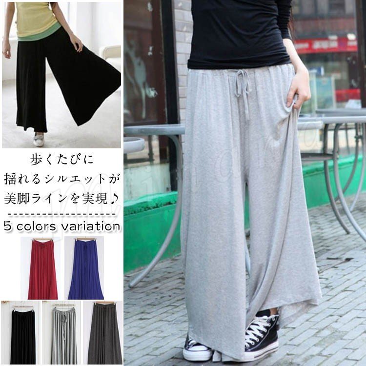 ガウチョ ワイドパンツ マキシ丈 フレアパンツ スカーチョ スカンツ ウエストゴム 無地 ブラック ネイビー ライトグレー ダークグレー レディース