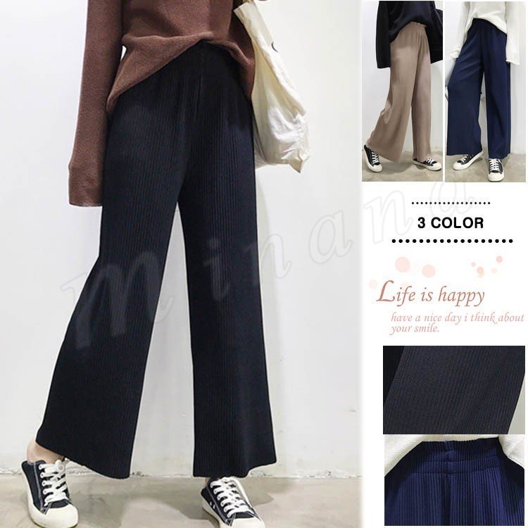 ウエスト楽ちんなトレンドワイドパンツ♪ ワイドパンツ レディース リブ ウエストゴム ビックシルエット 楽ちん ボトムス おしゃれ 可愛い ブ