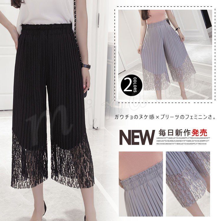 裾透けレース切り替えはチラ見せ効果を◎ガウチョパンツ シフォンガウチョ レース切り替え ストレート 九分丈パンツ シフォン ワイドパンツ プリ