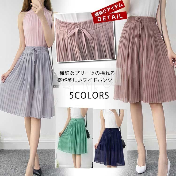 シフォン ワイドパンツ フレアパンツ 膝丈 スカーチョ プリーツ ガウチョパンツ プリーツ パンツ 春夏 ウエストゴム レディース