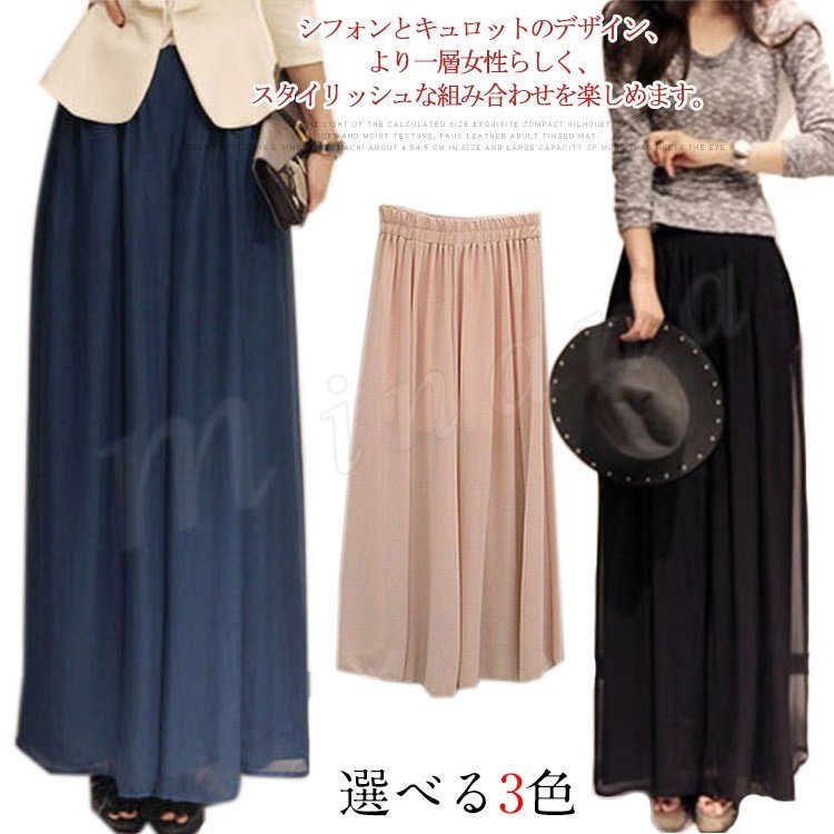 ゆったりスカート風デザインは着痩せ効果バツグン!シフォンロングパンツ ロング丈スカート風 レディース ワイドパンツ ガチョウパンツ キュロットパンツ