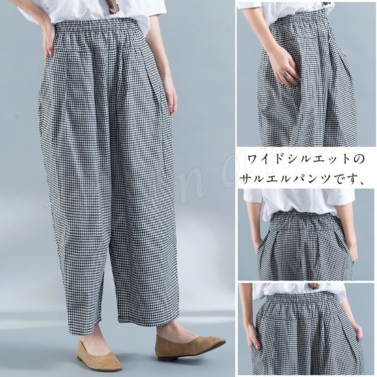 レディース ボトムス パンツ テーパードパンツ ワイド サルエルパンツ ゆったり チェック柄 ウエストゴム9分丈 体型カバー ブラック フリーサイズ