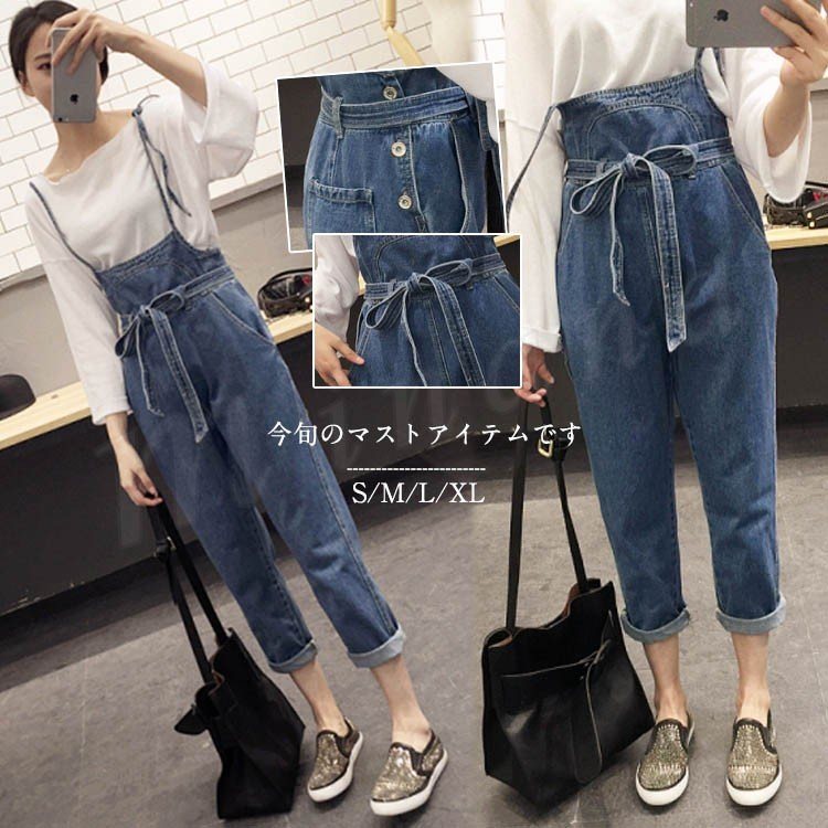 リボンベルト デニム サロペットパンツ デニム オールインワン ウエストリボン サロペット オールインワン デニム パンツ レディース
