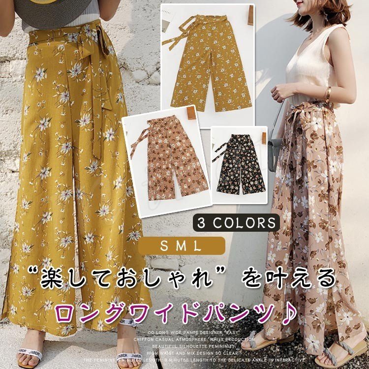 [3色展開]花柄ロングワイドパンツ ガウチョパンツ レディース春夏 ボトムス パンツ パンツロングワイドパンツ プリーツゆったり ロング丈可愛