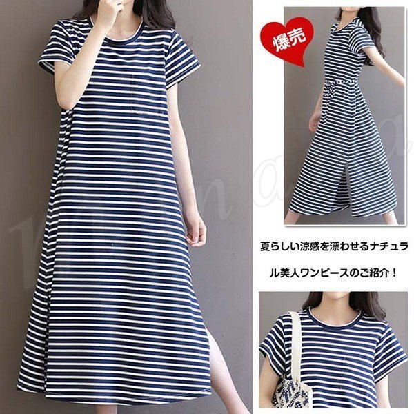 サマーワンピースボーダーワンピースナチュラル風ワンピースロングサイドスリットフレアワンピース森ガール系ワンピース2way着型