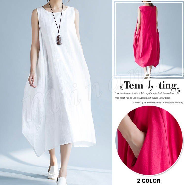 レディース リンネ ワンピース 綿麻 麻混 ロングワンピース 綿麻ワンピース ノースリーブ 無地 新作
