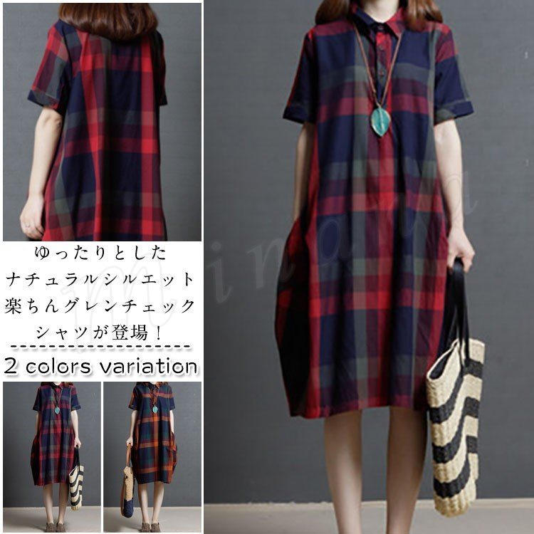 レディース ワンピース 半袖 シャツ チェック柄 シャツワンピース チェックシャツ ロングシャツ 膝丈 ゆったり 大きいサイズ 2カラー 4サイズ M