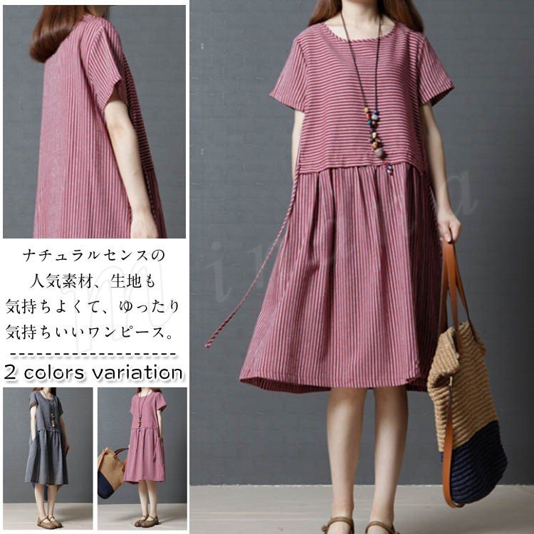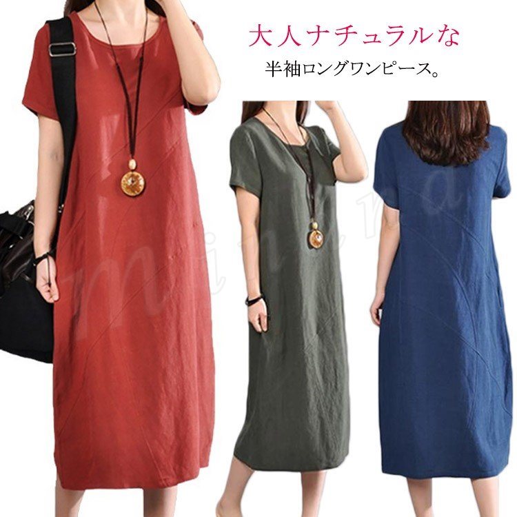 ワンピースロング丈夏半袖リネンレディースワンピースAライン無地ゆったりワンピース森ガール