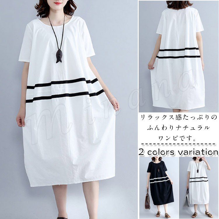 レディース ワンピース チュニック 半袖 Aライン ボーダー 切り替え ストライプ 無地 ゆったり 紐付き シンプル 大きいサイズ 2カラー 4サイズ