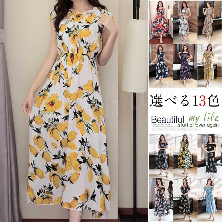 ワンピース リゾートワンピース ロングワンピース ワンピース チュニック 体型カバー ロング丈 半袖 肩出し ウエストゴム プリーツ ギャザー 花柄