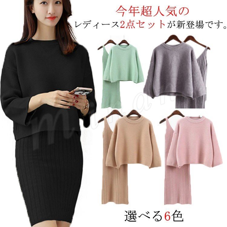ノースリーブリットワンピース ドルマンスリーブトップス 2点セット ニットセーター レディース トップス ゆったり リブニット ストレッチ 七分袖