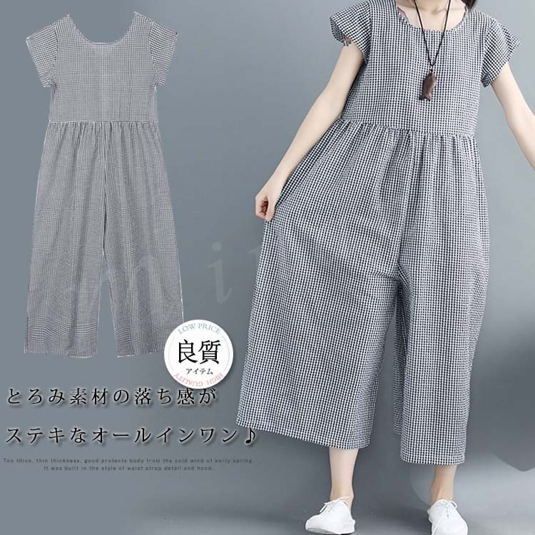 [チェック柄]オールインワン サロペット レディース 格子柄 半袖 マキシ丈 春夏 綿麻 ワイドパンツ 体型カバー 可愛い 女子 大きいサイズ