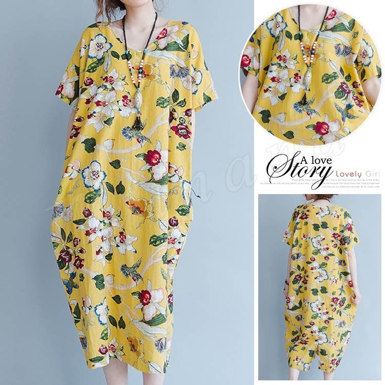 マキシワンピース 半袖 リゾート ワンピース レディース 花柄 ワンピース Aライン 大きいサイズ ロング リネン ワンピース 2018春夏新作