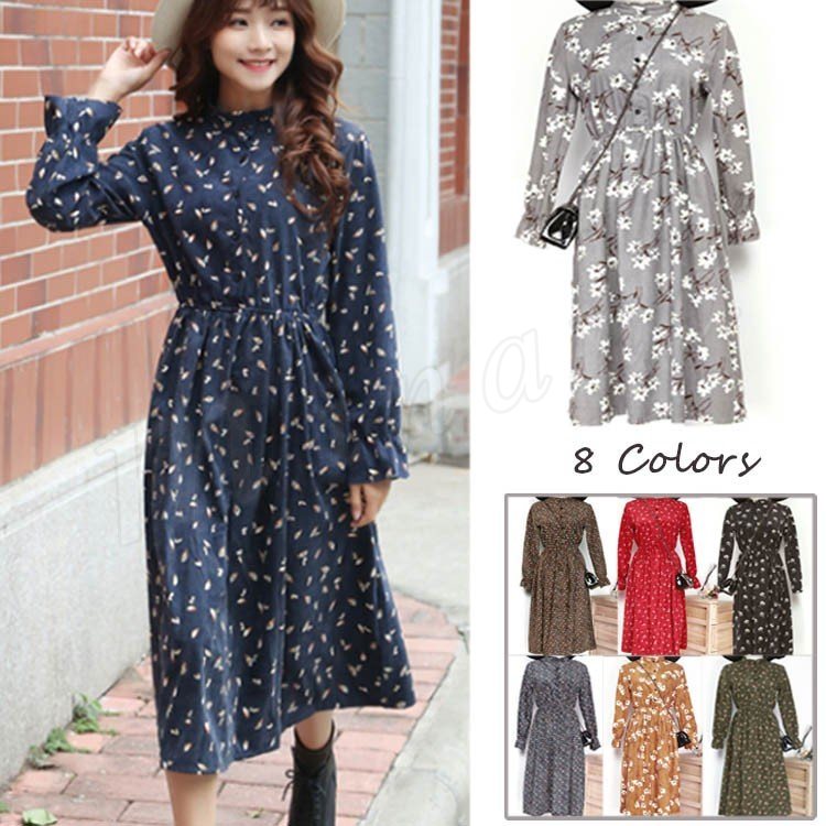 ワンピース/長袖ワンピース/立ち襟/コーデュロイ/花柄ワンピース/ロングワンピース/ミモレ丈/花柄/ゆったり/小花柄/ロング丈/チュニック/秋