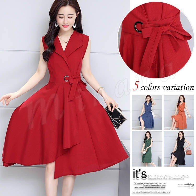レディースワンピース ロング丈ワンピース マキシ丈 ノースリーブワンピース デニムワンピース リボン ベルト クルーネック カジュアル 夏 リ