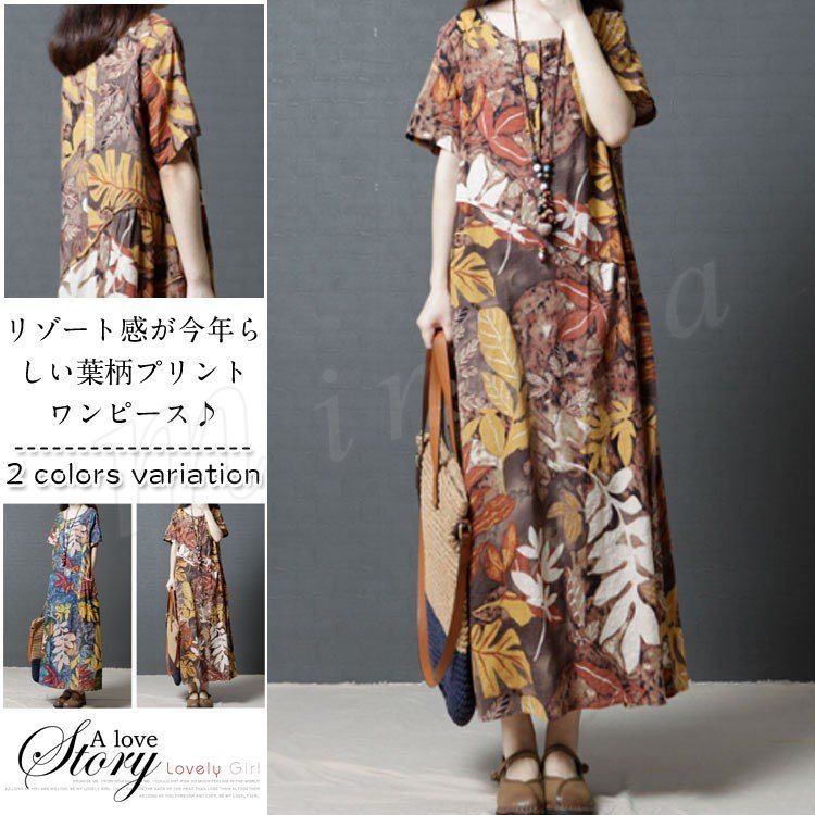 レディース 森ガール ワンピース マキシ丈 半袖 葉柄 プリント ラウンドネック ロングワンピース 民族風 ゆったり 大きいサイズ 2カラー 4サイズ
