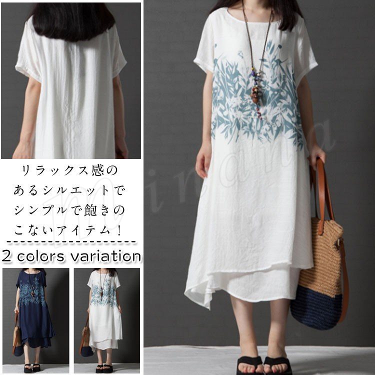 ワンピース ロングワンピース チュニック レディース ロング丈 ミモレ丈 体型カバー ゆったり ラウンドネック 半袖 重ね フラワー プリント柄 綿