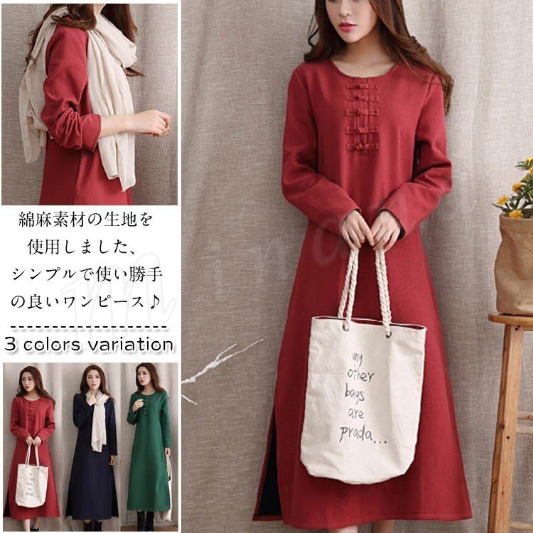 綿麻ワンピース 裏起毛ワンピース レディース 民族風 裏ボア エスニックチャイナ風ワンピース 森ガール風 マキシ ゆったり 暖かい 春 秋 2