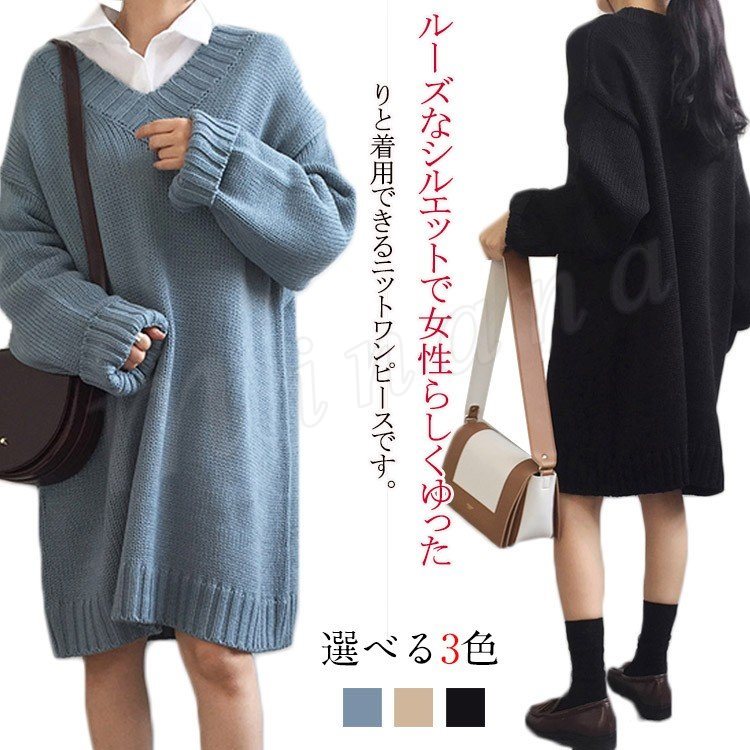 ロング丈 ニット ワンピース レディース Vネック ニットワンピース 膝丈 ニットワンピース ニット ベーシック ゆったり